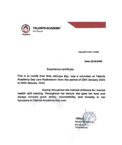 Meine Schulausbildung habe ich erfolgreich an der KPMHSS Poothotta in Kerala abgeschlossen, wo ich bis zur 12. Klasse (Klasse 12) unterrichtet wurde. Danach habe ich meinen Bachelor of Science in Chemie am Devamatha College in Kuravilangad absolviert. Diese akademische Laufbahn hat mich gelehrt, diszipliniert und zielstrebig zu arbeiten. Nach meinem Bachelor-Abschluss habe ich ein Diplom in Medical Scribing an der Medical ScribingAcademy erworben. Diese Ausbildung hat meine Fähigkeit, präzise und verantwortungsvoll zu arbeiten, zusätzlich gestärkt.